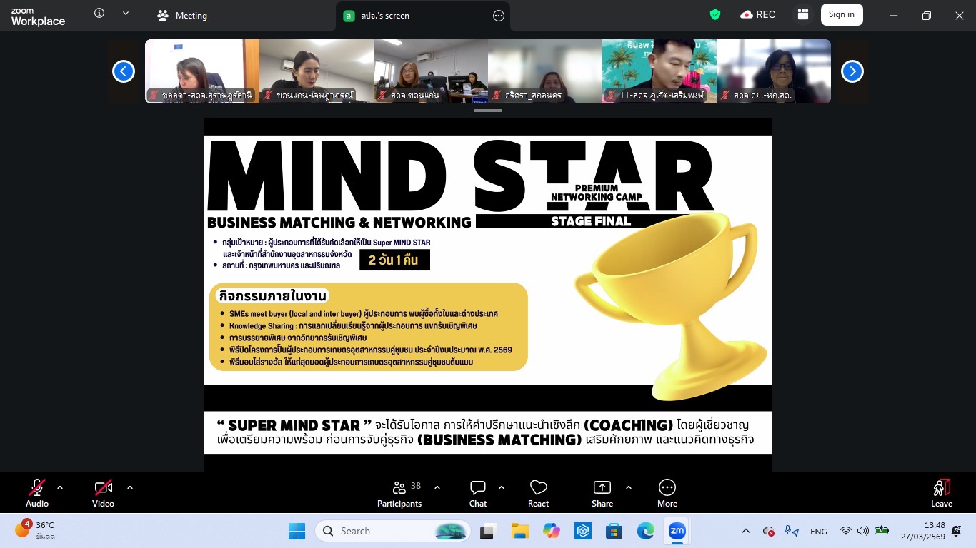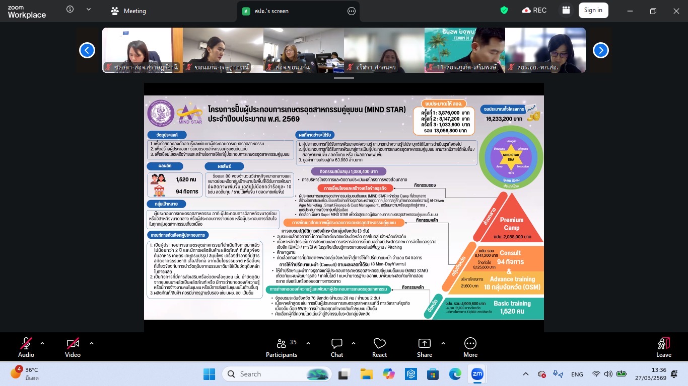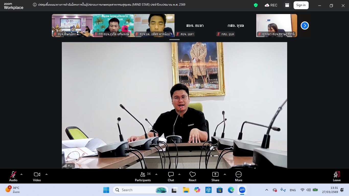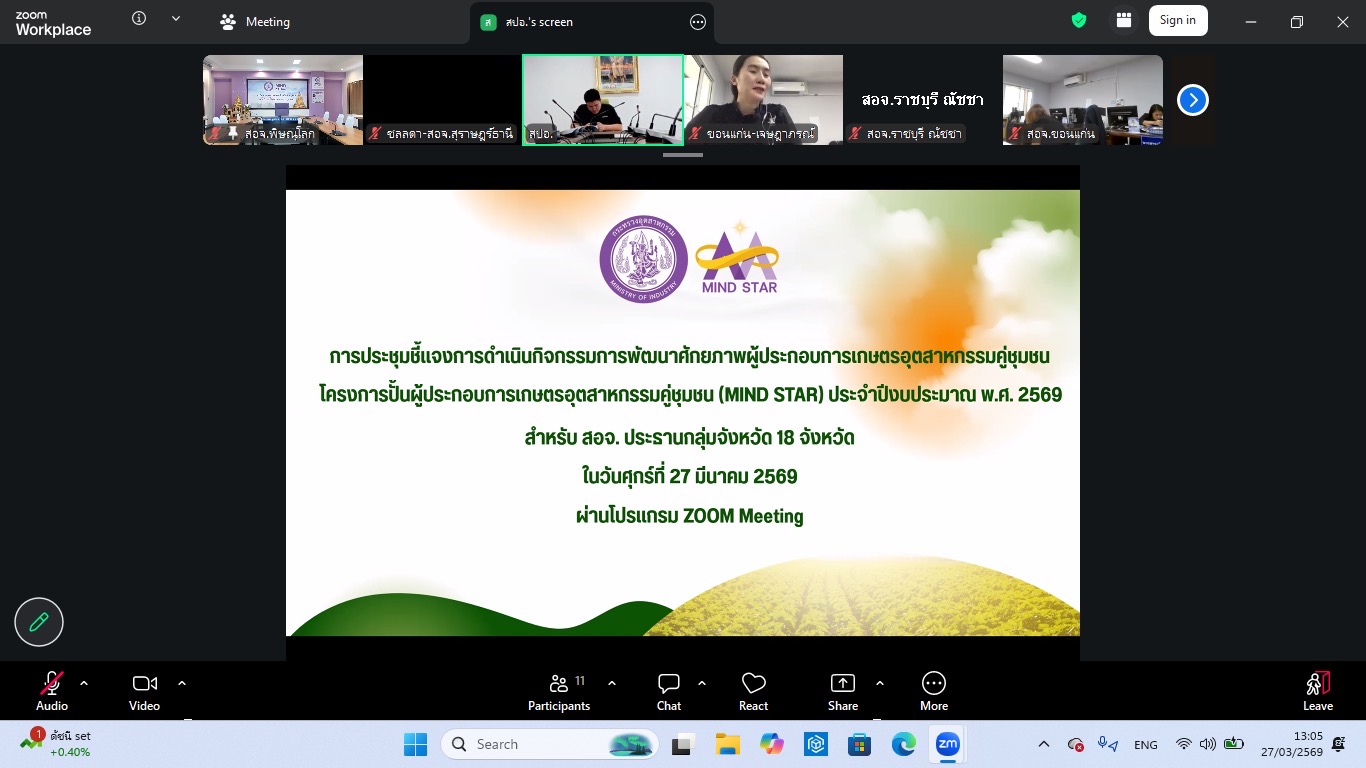 วันศุกร์ที่ 27 มีนาคม 2569 นางรินทร์รัตน์ดา ซึ้งสัมปทาน อุตสาหกรรมจังหวัดพิษณุโลก มอบหมายให้ นายจุมพล เพชรทวี หัวหน้ากลุ่มส่งเสริมและพัฒนาอุตสาหกรรม พร้อมด้วย นางสาวกรรณิการ์ เม่นชาวนา นักวิเคราะห์นโยบายเเละแผน และนางสาวจันทกานต์ เทียบทอง นักวิเคราะห์นโยบายเเละแผน เข้าร่วมประชุมรับฟังการชี้แจงแนวทางการดำเนินกิจกรรมการพัฒนาศักยภาพผู้ประกอบการเกษตรอุตสาหกรรมคู่ชุมชน ภายใต้โครงการปั้นผู้ประกอบการเกษตรอุตสาหกรรมคู่ชุมชน (MIND STAR) ประจำปีงบประมาณ พ.ศ. 2569 โดยมี นายธนวัฒน์ ไทยแก้ว ผู้อำนวยการกองยุทธศาสตร์และแผนงาน สำนักงานปลัดกระทรวงอุตสาหกรรม เป็นประธานและนำคณะชี้เเจงเรื่องดังกล่าว ผ่านทางออนไลน์ Zoom Meeting ณ สำนักงานอุตสาหกรรมจังหวัดพิษณุโลก ตำบลสมอเเข