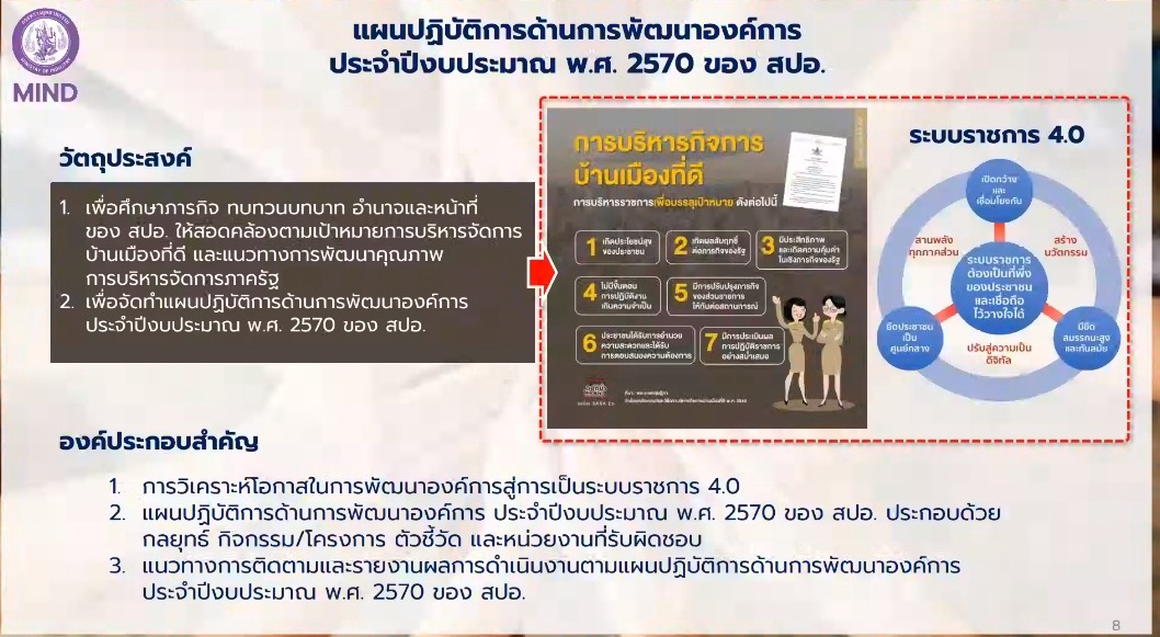 วันพุธที่ 8 เมษายน 2569 เวลา 09.00 น. นางรินทร์รัตน์ดา ซึ้งสัมปทาน อุตสาหกรรมจังหวัดพิษณุโลก มอบหมายให้นางสาวดุจดาว รุ่งเชตุ นักวิเคราะห์นโยบายและแผนชำนาญการ และนางสาวปนัดดา นุเครือ นักวิชาการอุตสาหกรรม เข้าร่วมประชุมรับฟังเชิงปฏิบัติการ “การพัฒนาองค์การตามแนวทางการบริหารจัดการตามหลักธรรมาภิบาลและการยกระดับการบริหารจัดการภาครัฐสู่ความเป็นเลิศ” จัดโดย กลุ่มพัฒนาระบบบริหารสำนักงานปลัดกระทรวงอุตสาหกรรม ซึ่งมีวัตถุประสงค์เพื่อให้ความรู้และให้คำปรึกแนะนำ โดยมี นางสาวสุภัตรา เปี่ยมวัตถาภรณ์ หัวหน้ากลุ่มพัฒนาระบบบริหาร เป็นผู้ชี้แจง ผ่านสื่ออิเล็กทรอนิกส์ Google Meet ณ สำนักงานอุตสาหกรรมจังหวัดพิษณุโลก ตำบลสมอแข อำเภอเมืองพิษณุโลก จังหวัดพิษณุโลก