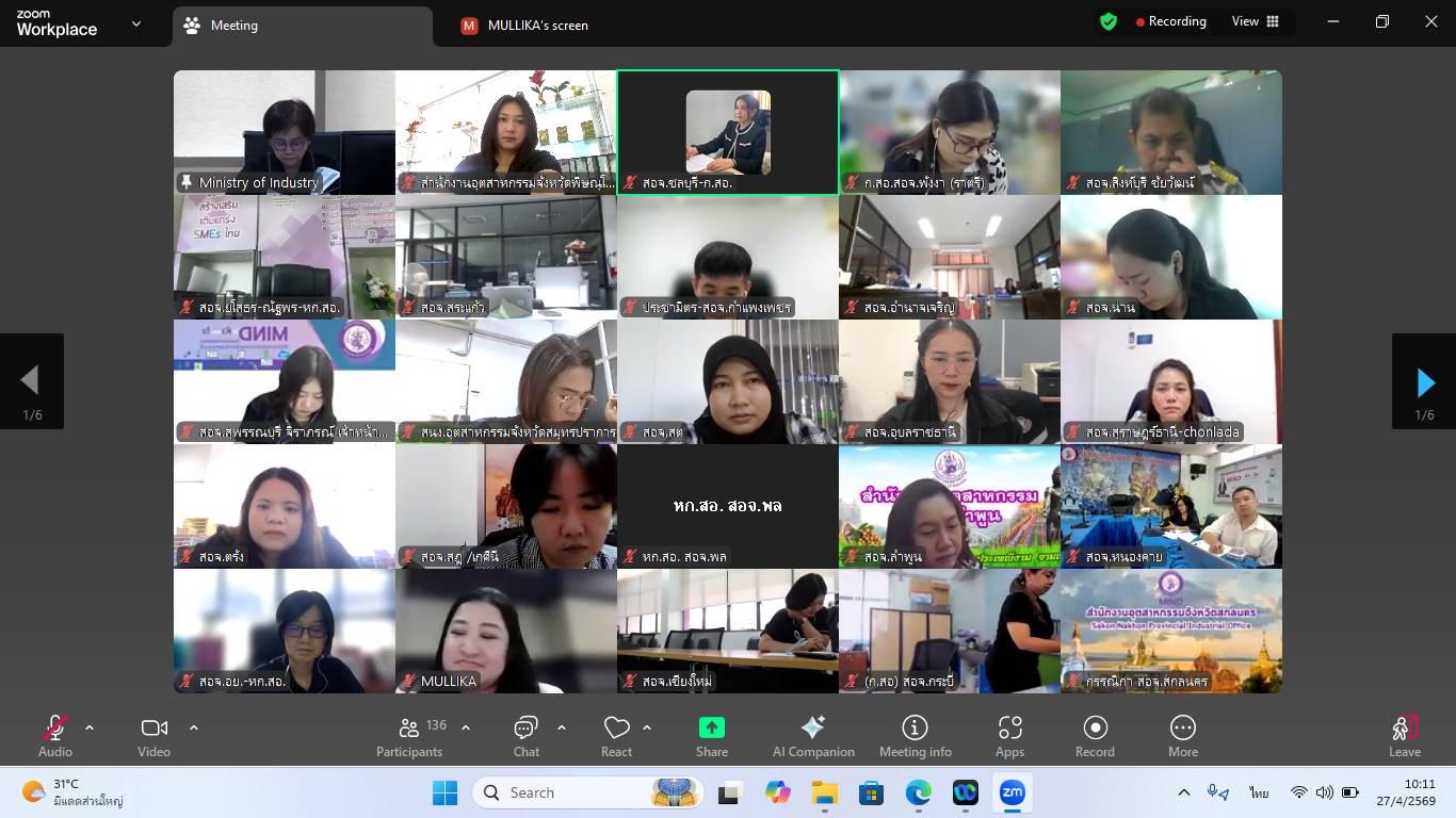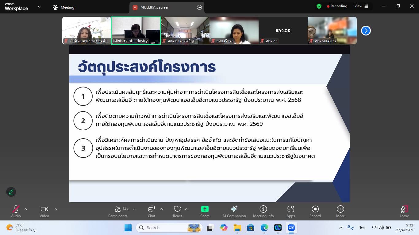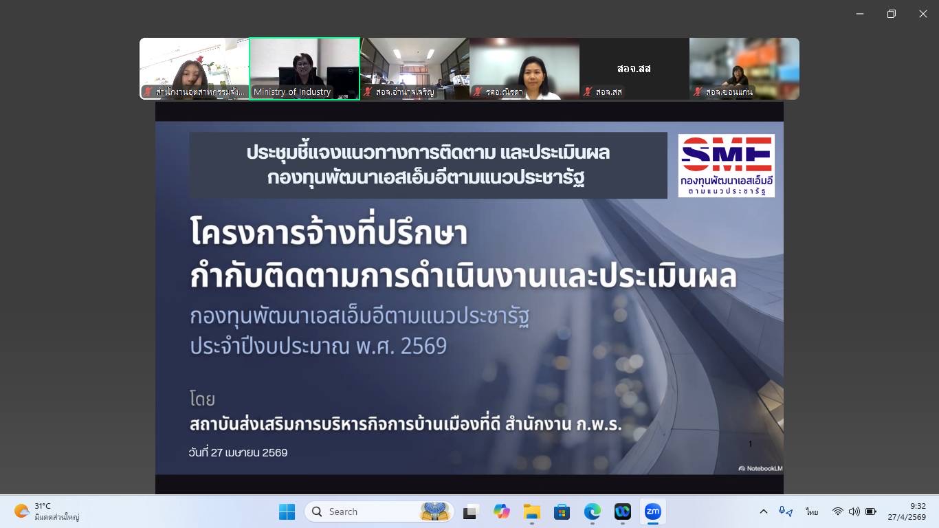 วันจันทร์ที่ 27 เมษายน 2569 เวลา 09.00 น. นางรินทร์รัตน์ดา ซึ้งสัมปทาน อุตสาหกรรมจังหวัดพิษณุโลกมอบหมายให้ นางสาวบุญสิตา กางด้วง เจ้าหน้าที่บริหารงานทั่วไป เข้าร่วมประชุมรับฟังการชี้แจงแนวทางการติดตามและประเมินผลกองทุนพัฒนาเอสเอ็มอีตามแนวประชารัฐ ประจำปีงบประมาณ พ.ศ. 2569 จัดโดยสำนักงานกองทุนพัฒนาเอสเอ็มอีตามแนวประชารัฐ สำนักงานปลัดกระทรวงอุตสาหกรรม ร่วมกับสถาบันส่งเสริมการบริหารกิจการบ้านเมืองที่ดีซึ่งมีวัตถุประสงค์เพื่อประเมินผลสัมฤทธิ์ และความคุ้มค่าจากการดำเนินโครงการสินเชื่อและโครงการส่งเสริมและพัฒนาเอสเอ็มอีตามแนวประชารัฐ โดยมี นางสาวณิรดา วิสุทธิชาติธาดา ผู้อำนวยการสำนักงานกองทุนพัฒนเอสเอ็มอีตามแนวประชารัฐ เป็นประธาน ผ่านสื่ออิเล็กทอรนิกส์ Zoom Meeting ณ สำนักงานอุตสาหกรรมจังหวัดพิษณุโลก ตำบลสมอแข อำเภอเมืองพิษณุโลก จังหวัดพิษณุโลก